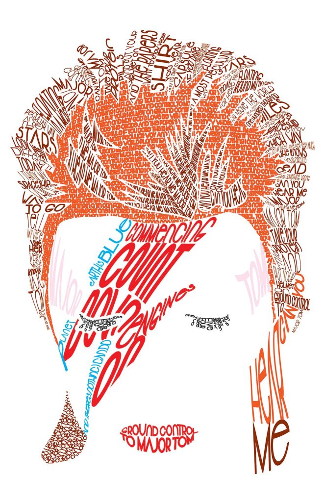 The piece uses a mix of fonts and styles that reflect the eclectic nature of Bowie's career. Each typeface represents a different facet of his artistic evolution. The text forms the contours and details of his face, creating a visual rhythm that mirrors the energy and creativity he brought to his music.